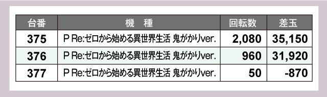 この日のメインはパチンココーナー。特に盛り上がりを見せていたのが『P Re:ゼロから始める異世界生活 鬼がかりver.』で、全3台中2台がプラスで終了、しかも、その2台がどちらも+30,000発オーバーを叩き出すという驚異的な結果を残しファンを喜ばせていた。