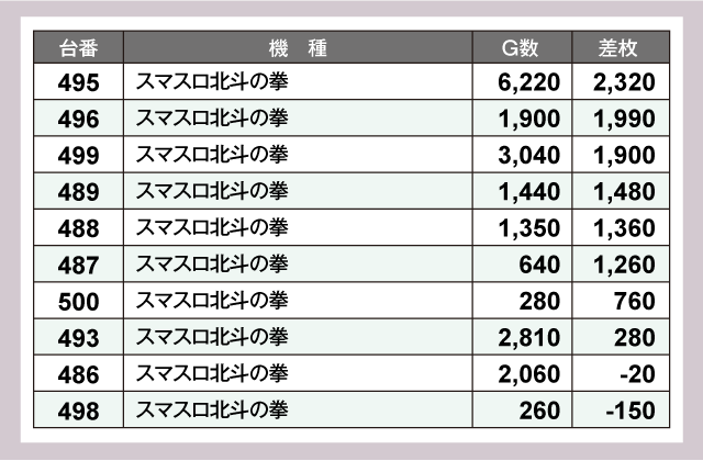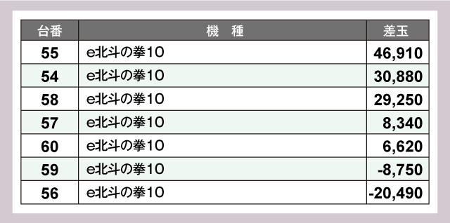 一方、パチンコも負けてはおらず『e北斗の拳10』では+20,000発超が3台、特に差玉ナンバー1の55番台が+46,910発を記録する圧巻の盛り上がりにファンも大喜びだった。