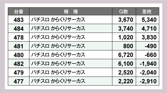 まずはパチスロの方をチェックしてみると『パチスロ からくりサーカス』で+3,000枚超が3台、なかでも483番台が5,340枚を叩き出す見事な結果を残している。