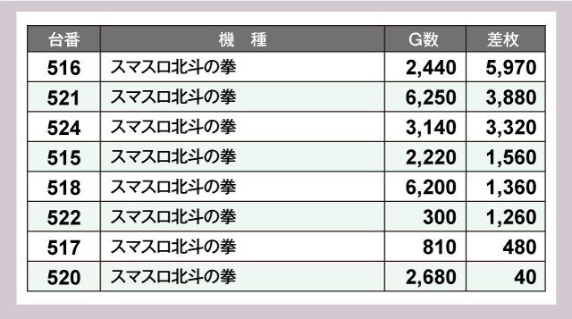 パチスロで好調だったのは『スマスロ北斗の拳』。516番台が+5,000枚オーバー、521番台と524番台が+3,000枚オーバーと見事な記録を叩き出している。