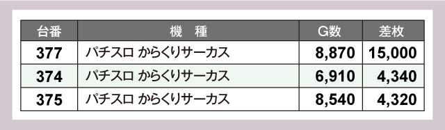 なかでも注目すべきは『パチスロ からくりサーカス』で、377番台が+15,000枚を記録、さらに『スマスロモンキーターンV』でも万枚超を叩き出す活況っぷりを見せていた。