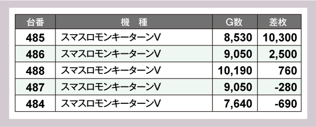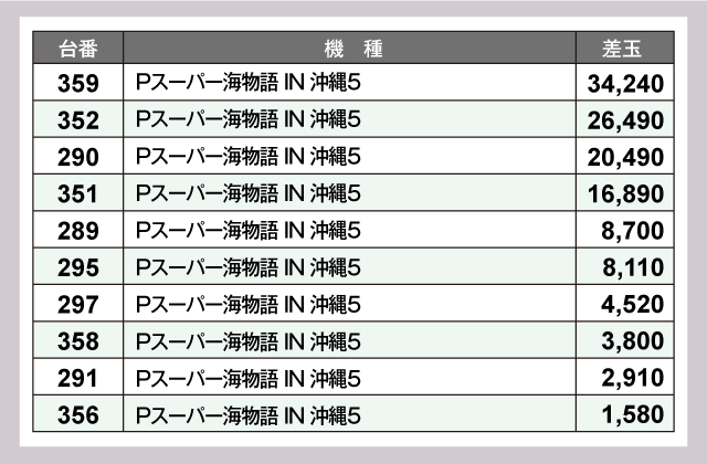 また、パチンココーナーでは『Pスーパー海物語 IN 沖縄5』が好調で万発超が4台も出現。差玉ナンバー1は怒涛の+34,240発という見事は結果を残している。