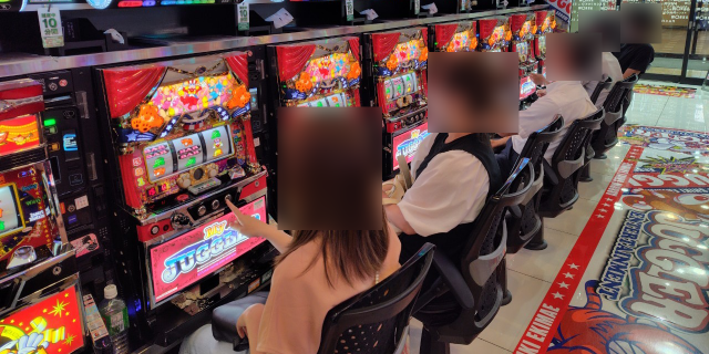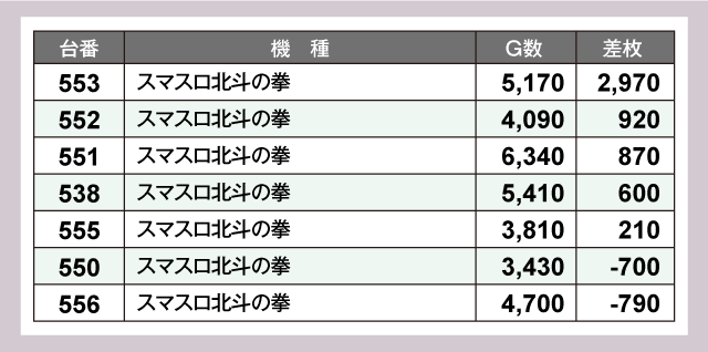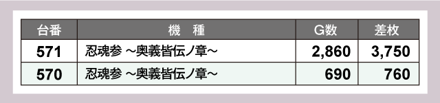 店内状況をチェックすると、『マイジャグラーⅤ』の+4,400枚を筆頭に『忍魂参 ~奥義皆伝ノ章~』で+3,750枚、『ファンキージャグラー2』で+3,640枚、『スマスロ北斗の拳』で+2,970枚など、あらゆる機種で好調な台を確認できた。特定の機種に偏ることなく「全てのシマにチャンスが潜んでいる」という印象を受けた一日であった。
