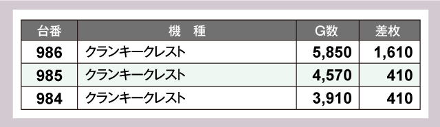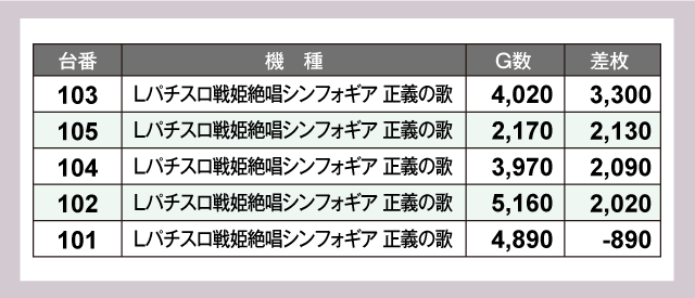 まず、パチスロでは『Lパチスロ戦姫絶唱シンフォギア 正義の歌』が好調で全5台中4台が+2,000枚超を記録。また、派手さは控えめなものの3台設置の『クランキークレスト』は全台がプラスで終了するという見事な結果を残している。