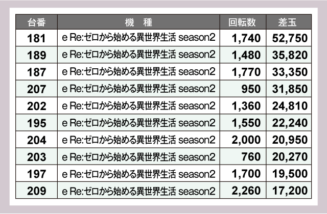 一方のパチンコは、『e Re:ゼロから始める異世界生活 season2』から万発超が大量発生!! 特に出玉ランキングナンバー1の181番台が驚愕の50,000発超を叩き出しているだけに、ファンも大満足の一日となっただろう。