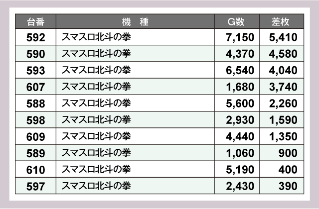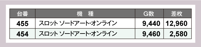 今回のメインはパチスロで、最も注目となったのが『スロット ソードアート・オンライン』で、万枚超の+12,960枚を記録。また『スマスロ北斗の拳』では+3,000枚超が続出するほか、出玉ナンバー1は+5,410枚を叩き出す好成績を残している。