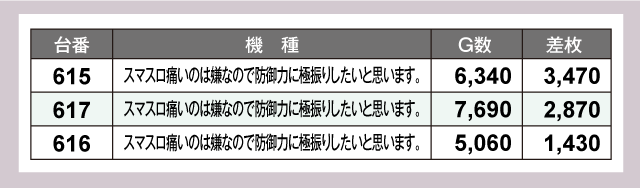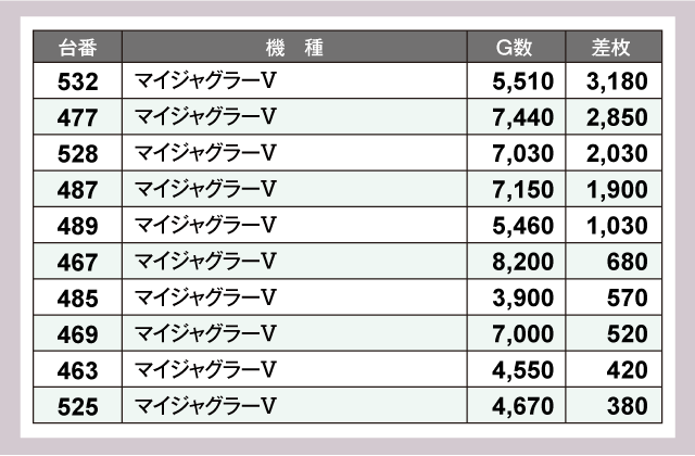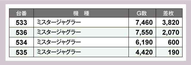 また、ジャグラーシリーズからも好調台を多数確認。『マイジャグラーⅤ』で+3,180枚、『ミスタージャグラー』からも+3,820枚が出現する活況っぷりを見せ店内を盛り上げていた。