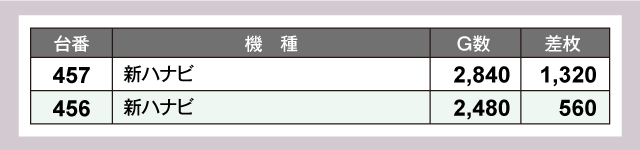 まず、パチスロで注目を集めたのが『スマスロモンキーターンV』で、506番台が+4,380枚、507番台が+3,240枚を記録し店内を盛り上げていた。また、2台設置されている『新ハナビ』はどちらもプラス域で終了という見事な結果を残している。