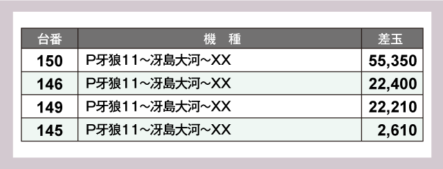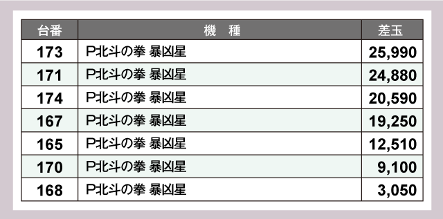 一方のパチンコは『P北斗の拳 暴凶星』から+10,000発超が2台、+20,000発超が3台、さらに『P牙狼11〜冴島大河〜XX』からは+55,350発という大記録が発生しており、シマ中にファンの笑顔が溢れ返っていた。