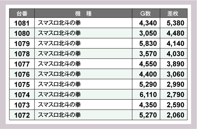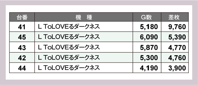 とくに目立ったのはパチスロコーナー。「L ToLOVEるダークネス」41番台が+9,760枚と、惜しくも万枚という好結果を残した。+2,000枚が続出の「スマスロ北斗の拳」からは、1081番台が+5,380枚。ついで+4,000枚超えが3台と大きな成果をあげている。