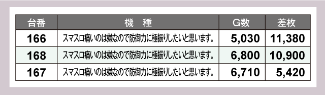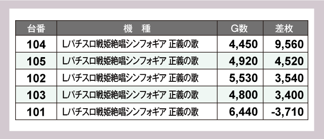 また、『Lパチスロ戦姫絶唱シンフォギア 正義の歌』では全5台中4台が+3,000枚超、そのうちの1台は+9,560枚を叩き出す見事な結果を残している。