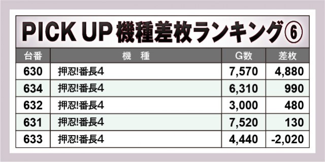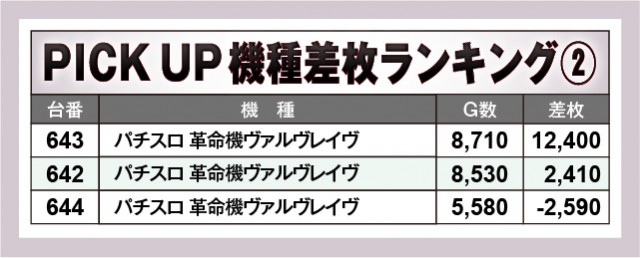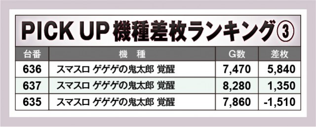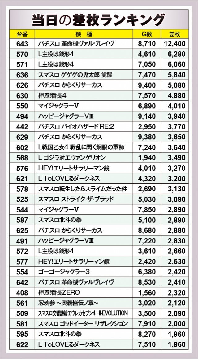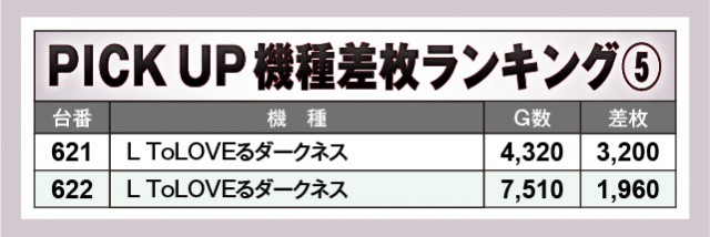 上表の6機種はしっかりと打ち込まれており、遊技していたファンが手応えを感じていた様子が手に取るように分かる。『L主役は銭形4』『L ToLOVEるダークネス』は全台プラス差枚数をマーク、その他も大きな熱気を放っており、レバーを叩く力が自然と強くなっていたことだろう。同店の高い実力が窺える内容で、今後も目が離せない存在だ。