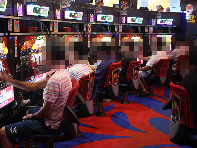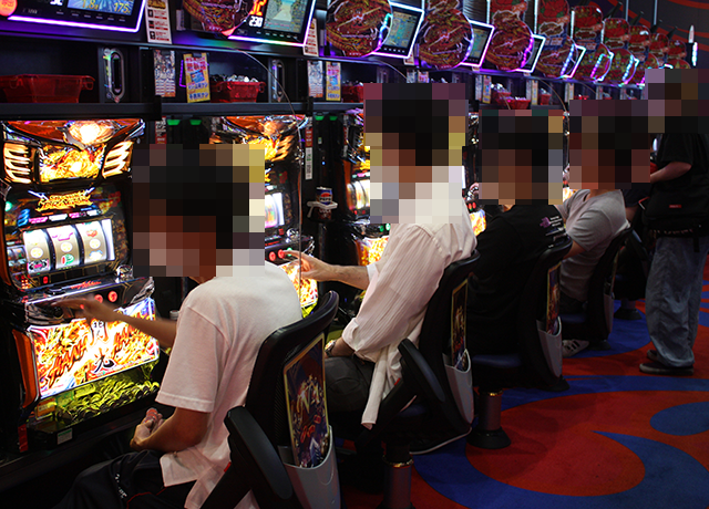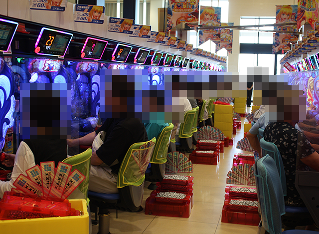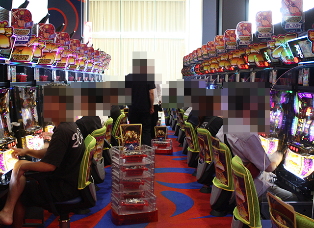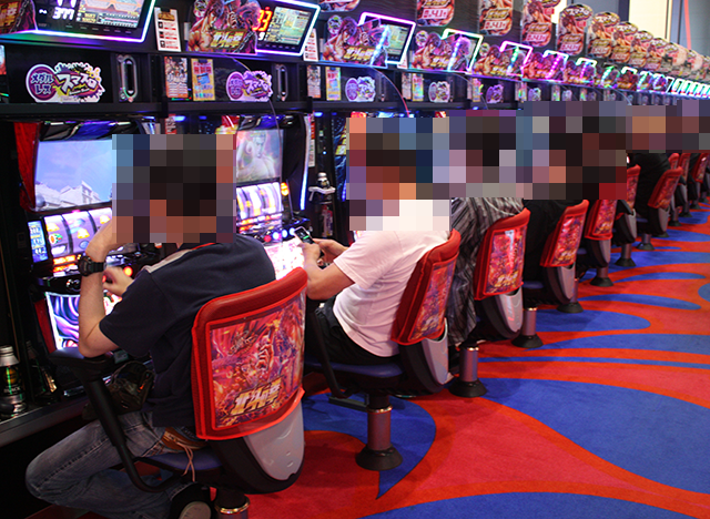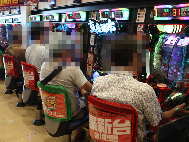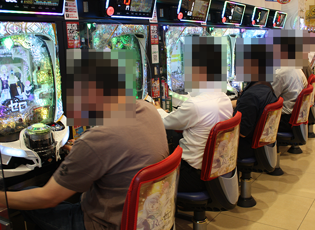 持ち玉を使い、笑顔で遊技をおこなっているプレイヤーが並んでいた。