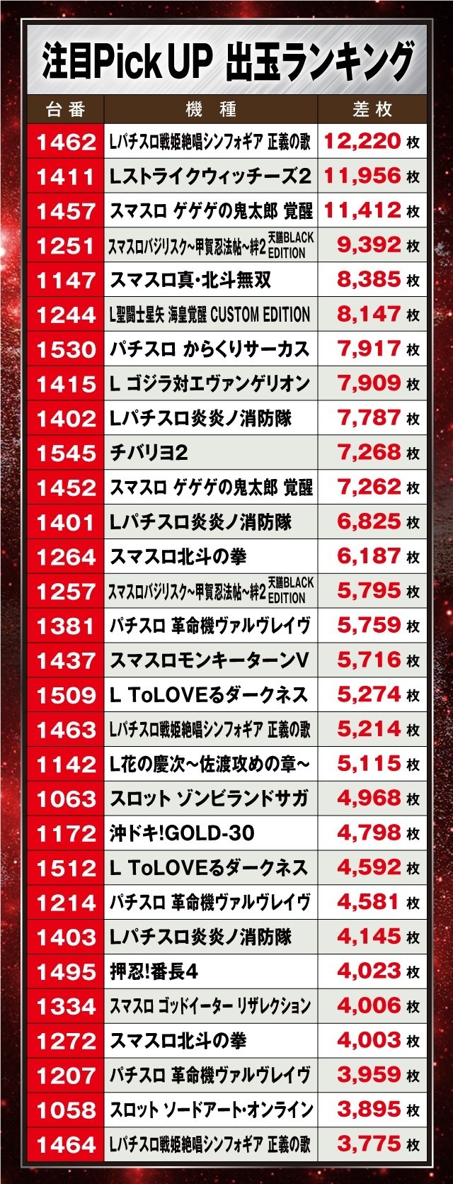 また、定番の人気機種も大奮闘しており『スマスロバジリスク~甲賀忍法帖~絆2 天膳BLACK EDITION』で+9,392枚、『L聖闘士星矢 海皇覚醒 CUSTOM EDITION』で+8,147枚など、+5,000枚超が16台も出現しているだけにファンも大満足だったはずだ。