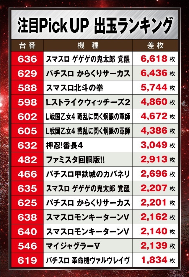 この日も人気のスマスロをメインに+3,000枚超の好調台が多数出現、なかでも出玉ランキング1に輝いた『スマスロ ゲゲゲの鬼太郎 覚醒』は+6,618枚を記録、2位の『パチスロ からくりサーカス』も+6,000枚超を叩き出しパチスロコーナーを盛り上げていた。