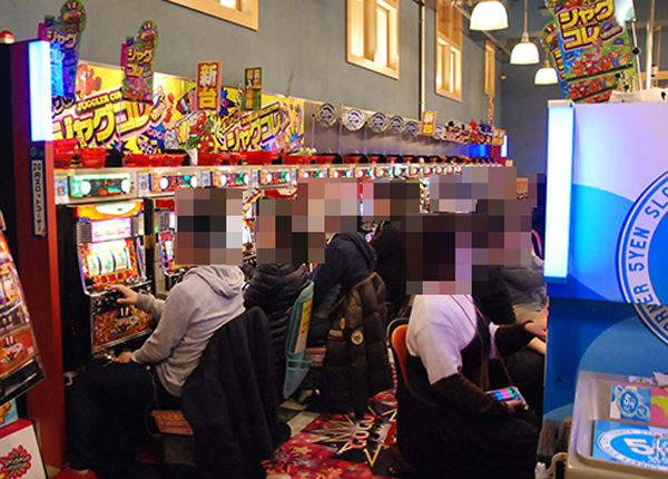稼働率の高い5円パチスロにも、笑顔のプレイヤーが多数。