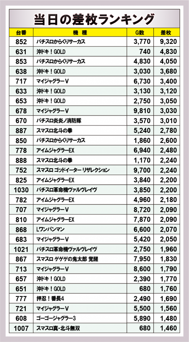 優秀台には幅広い機種群が名を連ねており、誰もが手応えを感じていたのではないだろうか。力強くレバーを叩いた結果、『パチスロからくりサーカス』で万枚OVER台が発生。さらに、『沖ドキ!GOLD』『マイジャグラーⅤ』『パチスロ炎炎ノ消防隊』から+3~4,000枚をマークするなど、まとまった出玉を獲得したファンが笑顔を浮かべていた様子が窺えた。