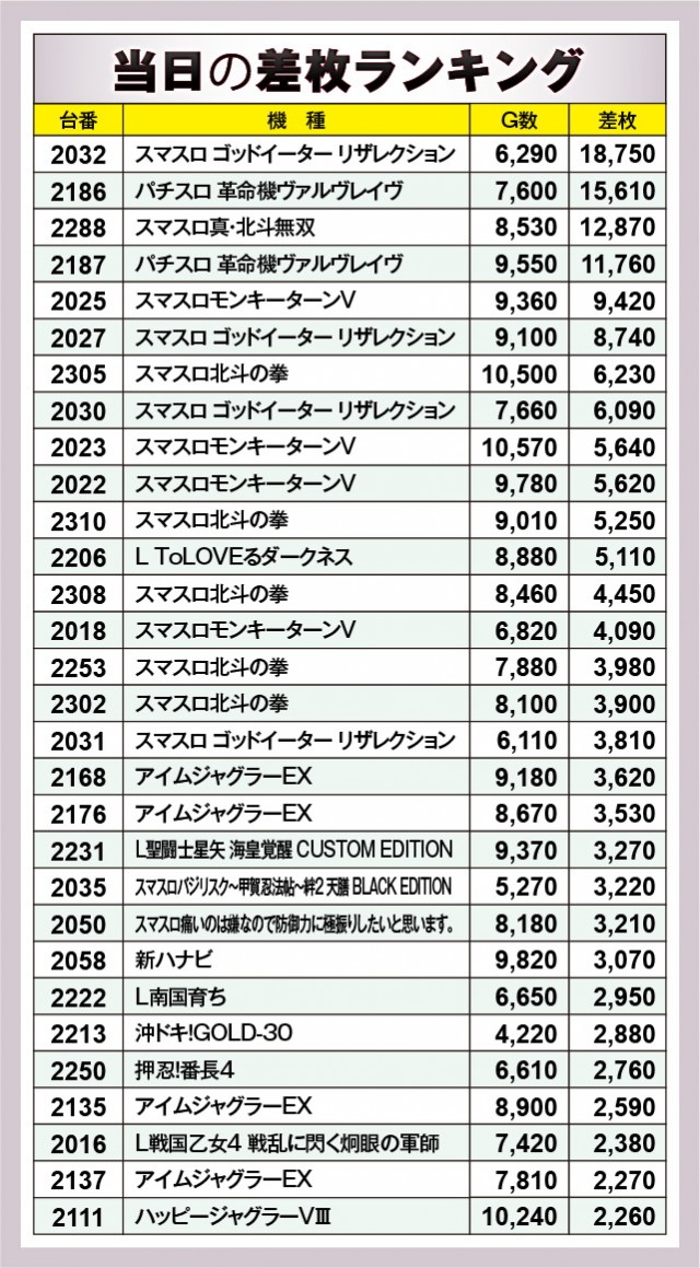 『スマスロ ゴッドイーター リザレクション』『パチスロ 革命機ヴァルヴレイヴ』『スマスロ真・北斗無双』から4台の万枚OVERが発生、さらに『スマスロモンキーターンV』9,000枚OVERといった盛り上がりを確認でき、ファンは有意義な時間を過ごしていたことだろう。全体を見ても終日を通して打ち込まれた回転数となっており、打ちごたえのある状況に満足していたのは間違いない。