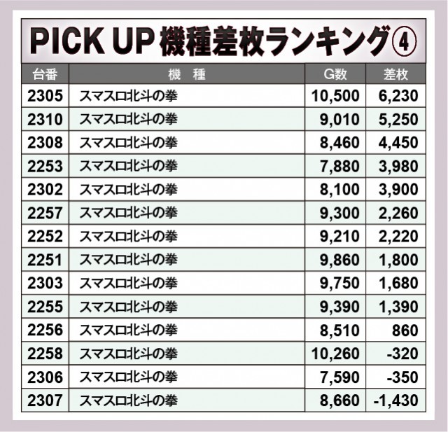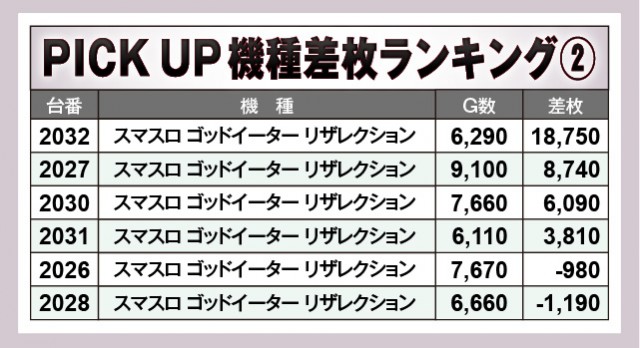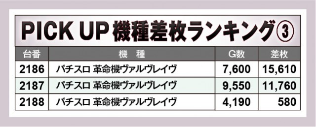 上表の機種はいずれも大きなマイナスを築いておらず、回転数も伴っていることから、ファン一人ひとりが可能性を感じ取っていたようだ。その中で『スマスロ ゴッドイーター リザレクション』から18,750枚と大きな熱気が放たれ、『スマスロ北斗の拳』『スマスロモンキーターンV』でもまとまった出玉を獲得していた様子が顕著である。『パチスロ 革命機ヴァルヴレイヴ』も2台の万枚OVERを輩出するなど、そのポテンシャルは明らかだ。