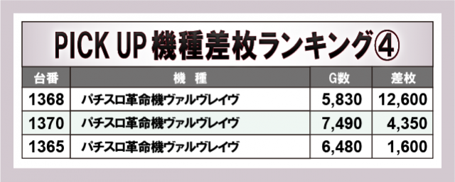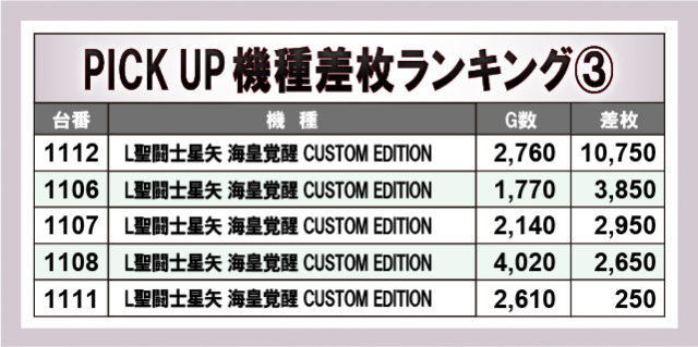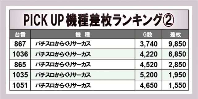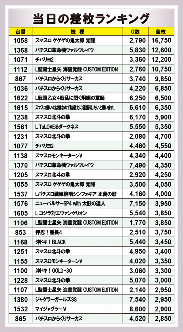 当日とくに店内を盛り上げた機種は上表の5機種。スマスロ人気機種たちから万枚OVER台を筆頭に4桁プラス差枚を記録した台が複数存在し、打ちごたえのあるエリアとなっていたのは間違いなそうだ。