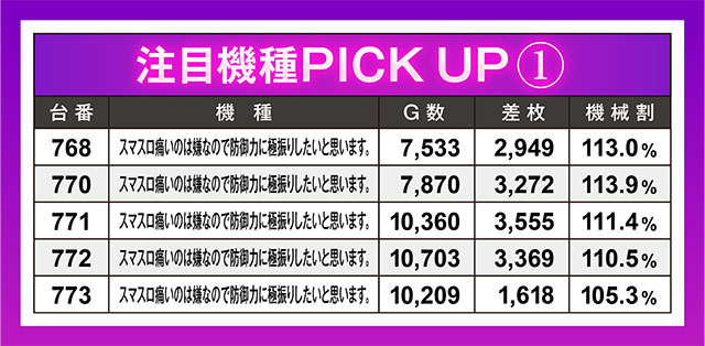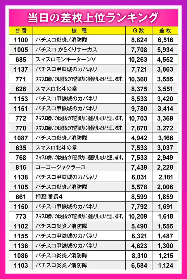 この日の最高差枚記録となったのは、『パチスロ炎炎ノ消防隊』。+6,500枚超えの好記録で、なみいるハイスペマシンを押しのけ、首位の栄冠に輝いた。特筆すべきは、5台すべてがランクインを果たした『スマスロ痛いのは嫌なので防御力に極振りしたいと思います。』。この結果を予測できた人はいたのか?