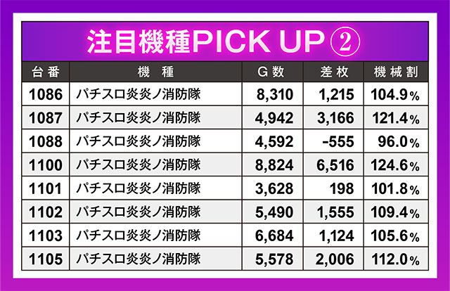 8台設置の『パチスロ炎炎ノ消防隊』もかなり状況が良好だった機種の1つ。8台中7台がプラス差枚となっており、マイナスの1台もわずかなマイナス数値。1100番台の勢いが特に凄まじく、あれよあれよと+6,500枚を突破!