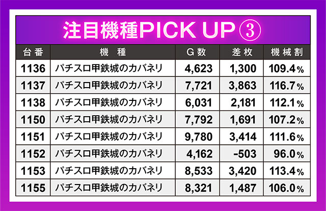 『パチスロ甲鉄城のカバネリ』も文句なしの状況に。8台中7台がプラス!さらにプラスの7台のうちの3台が+3,000枚を上回り、機種単位で環境がよかったことを物語っていた。
