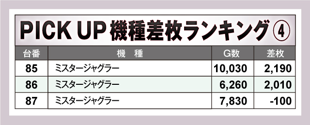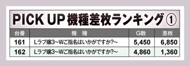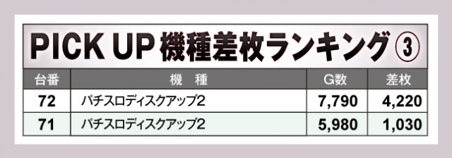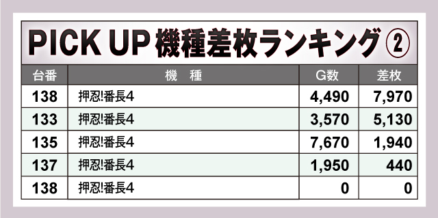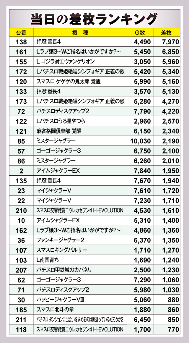 まずは差枚ランキングのチェックから。30台のうち26台が+1,000枚オーバーで、+2,000枚オーバーは13台出現。それらのなかでもっとも優秀だったのは、138番台の「押忍!番長4」で、差枚+7,970枚をマーク! その他の機種を見渡すと、スマスロやジャグラーシリーズなど、ファンたちから人気の高い機種を中心にランクイン! 店内全体にチャンスが隠されていたようだ!