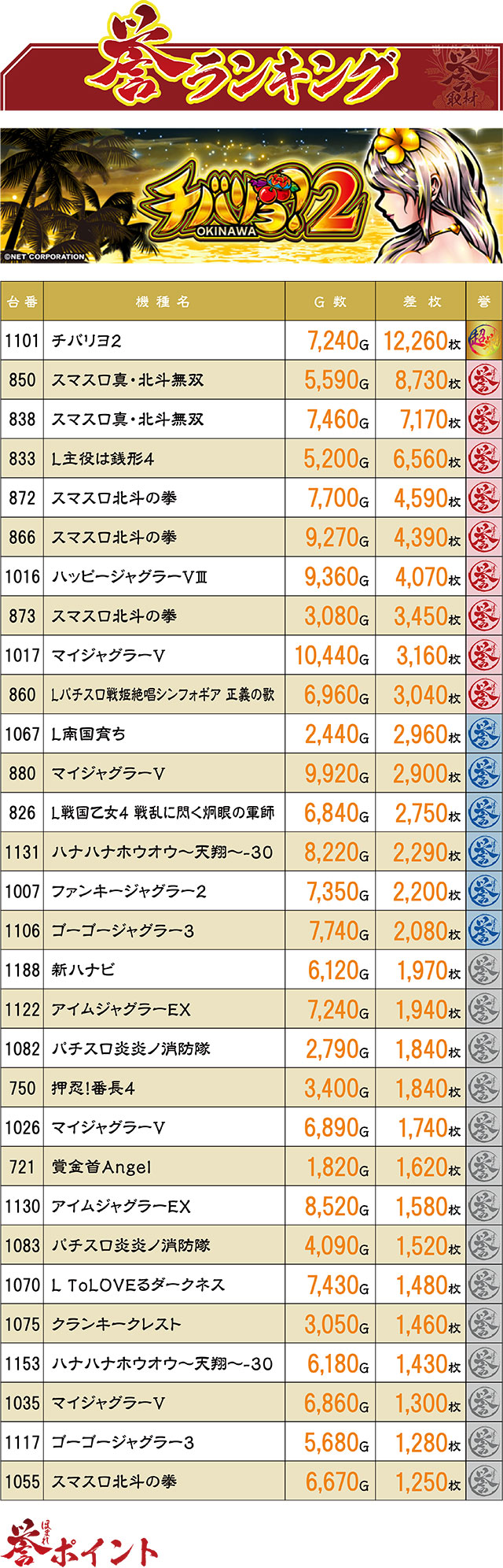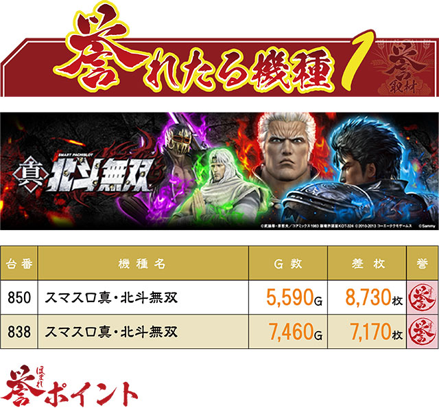 3台中2台が誉ランキングの2・3位にランクインという快挙を達成!それも2台ともが7,000枚オーバーという納得の結果だった。この結果から推察するに、同機は3台ともが優秀台だった可能性も…!?