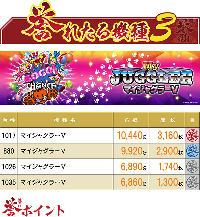 様々な『ジャグ』がランクインしていたが、その中で最も多くランクインしていたのは『マイジャグラーⅤ』。前回は5,000枚超え記録が生まれるなど、やはり「何かしてくれるかも」感が漂う機種と言える。