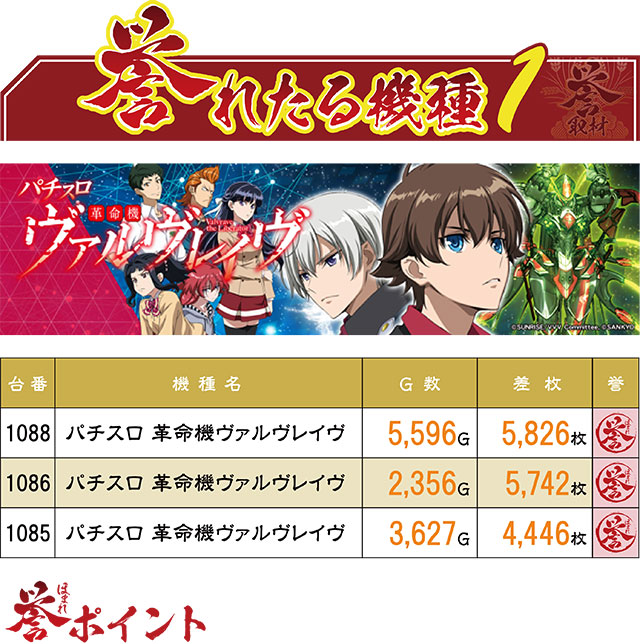 3台の赤誉マーキングが飛び出したのは『パチスロ 革命機ヴァルヴレイヴ』。3台ともが+4,000枚オーバーという、相変わらず高いポテンシャルを披露!何かやってくれる感がすごい!