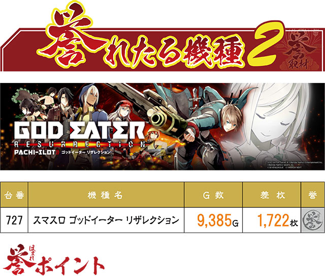 4台設置の『スマスロ ゴッドイーター リザレクション』は、4台ともがプラスに。大きな差枚結果こそなかったものの、この安定感は嬉しい限り。
