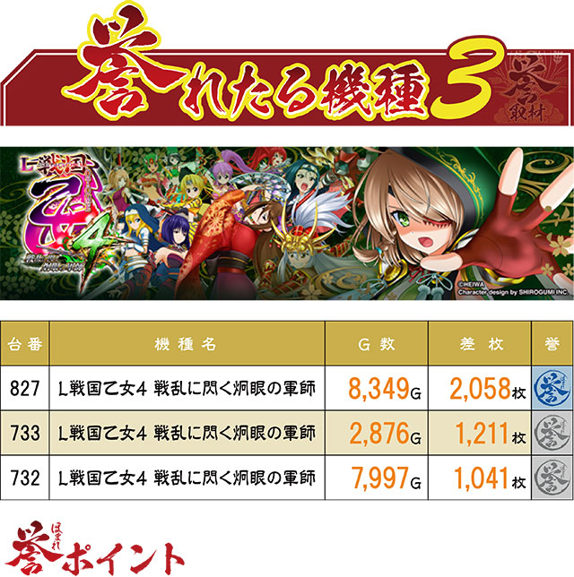 『L戦国乙女4 戦乱に閃く炯眼の軍師』からは赤誉レコード(=3,000枚以上)が生まれることはなかった。しかし複数の台が良い挙動を見せており、環境は決して悪くなかった様子。
