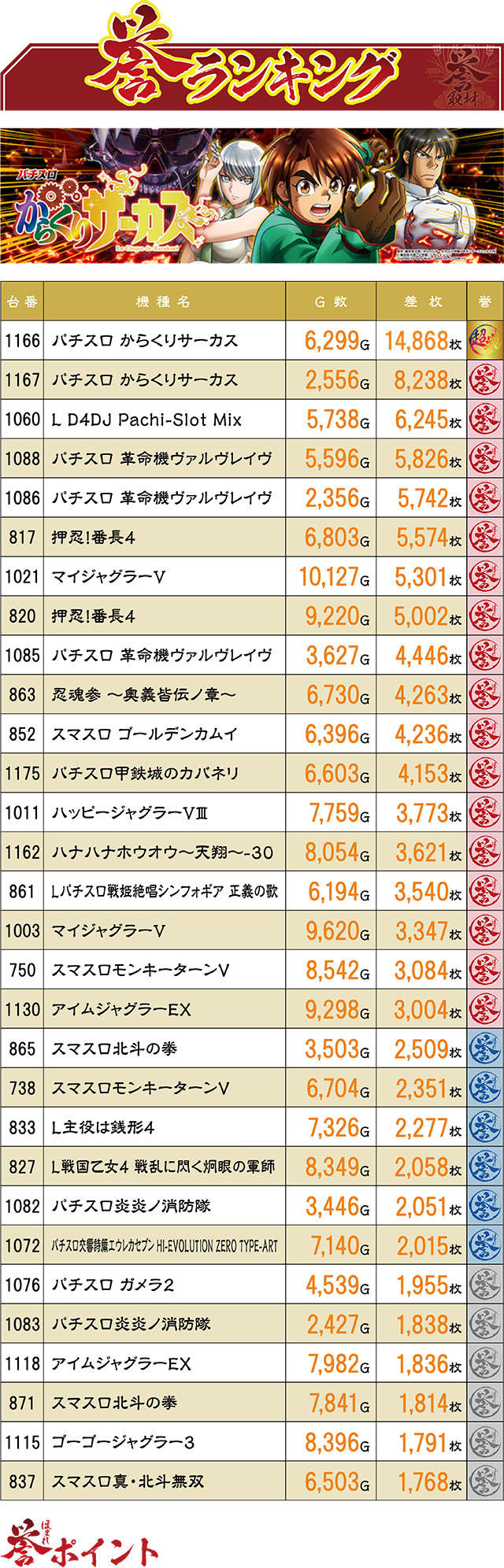誉ランキングの1・2フィニッシュを飾ったのは『パチスロ からくりサーカス』。特に1位の記録は+14,868枚という文句ナシの結果に。また3位には意外な伏兵『L D4DJ Pachi-Slot Mix』がランクインし、様々な機種が活躍を見せてくれた。