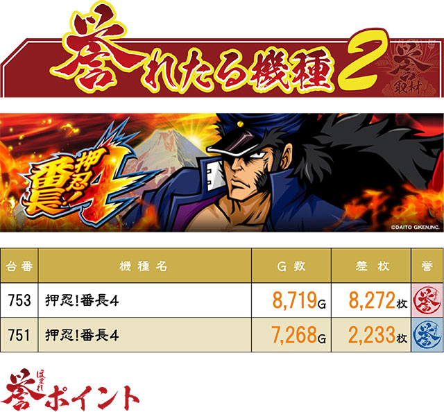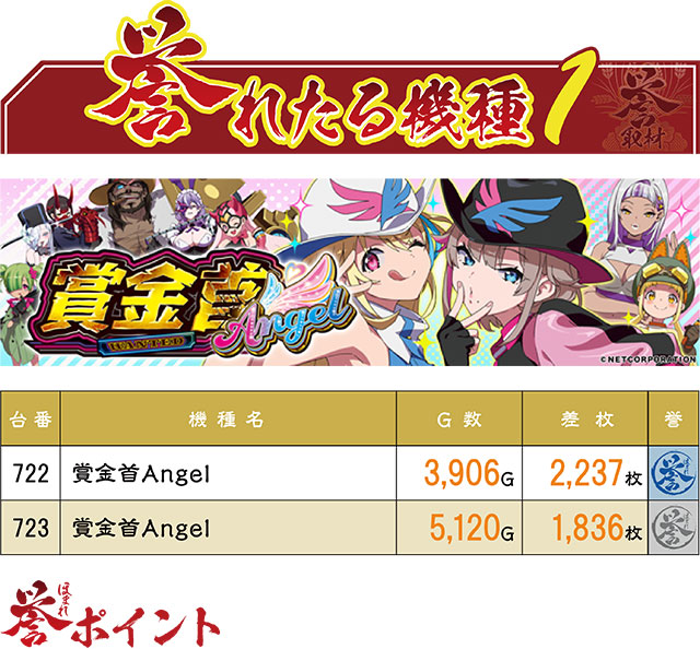 4台設置の『賞金首Angel』は、なんと4台すべてがプラス差枚に。しかもそのうちの2台に誉マーキングが付くなど、まずまずの内容だった。惜しむらくは、3,000枚を超える結果が生まれなかったこと。