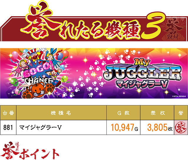 30台もの設置を誇る『マイジャグラーⅤ』だが、誉マーキングは1台のみという結果に…。しかしこの1台は4,000枚に迫る猛記録となっており、改めてポテンシャルの高さを見せつける結果となった。