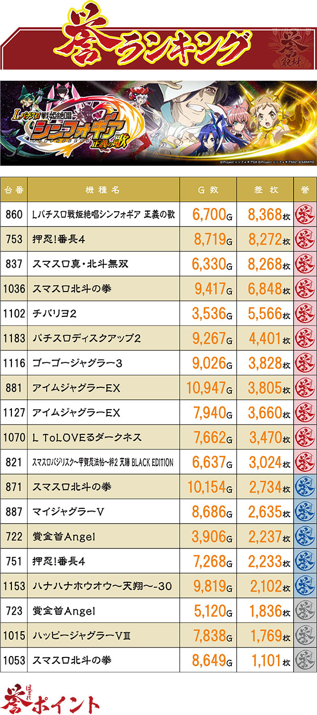 『Lパチスロ戦姫絶唱シンフォギア 正義の歌』と『押忍!番長4』と『スマスロ真・北斗無双』が熾烈な首位争いを繰り広げ、揃って8,000枚オーバーを達成!壮絶な接戦の末、『シンフォ』がこの日のTOP差枚レコードの座に君臨した。またこの日は『ジャグラー』シリーズや沖スロからも好記録が続出…!