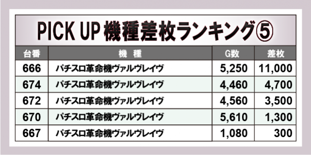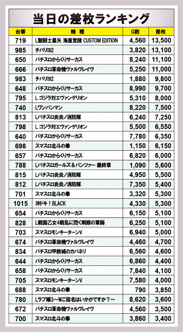 この日、圧巻のパフォーマンスを披露した事実は上表からハッキリと読み取れるだろう。『L聖闘士星矢 海皇覚醒 CUSTOM EDITION』『チバリヨ2』『パチスロからくりサーカス』『パチスロ革命機ヴァルヴレイヴ』で万枚OVERを達成、それでいてピックアップした30台は3,000枚OVERとなっており、凄まじい熱気が放たれていたと分かる。また回転数にしても開店から閉店までじっくりと打ち込まれており、遊技していたファンが相当な手応えを感じていたのも手に取るように分かるだろう。