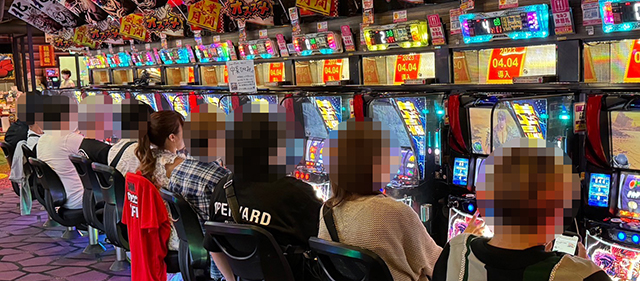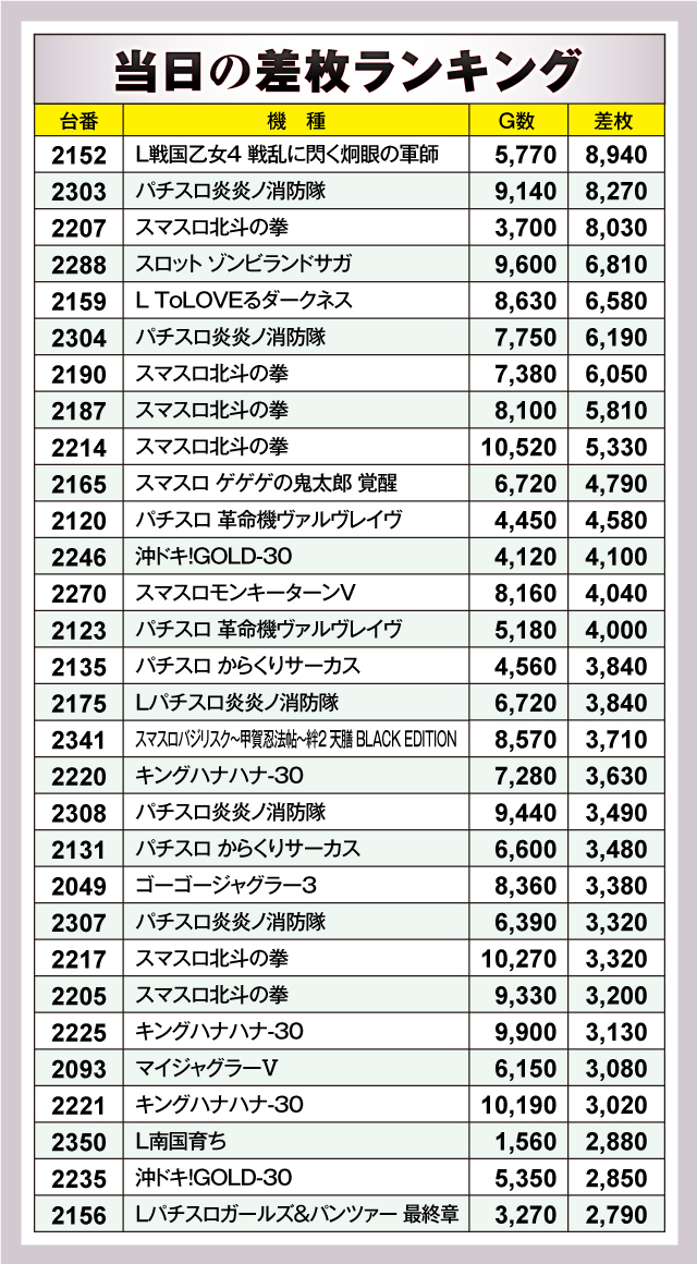 当日の差枚ランキングを見てみると、『L戦国乙女4 戦乱に閃く炯眼の軍師』『パチスロ炎炎ノ消防隊』『スマスロ北斗の拳』の3機種から8,000枚OVERという熱気が放たれていた。さらに6,000枚OVERが4台出現するなどパチスロ各コーナーから存在感を見せつける台が出現し、ホール内の熱気を存分に高めていた。