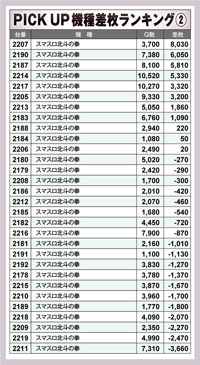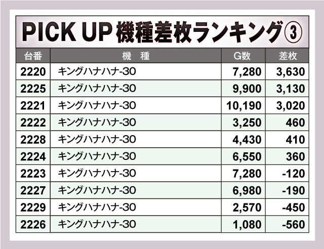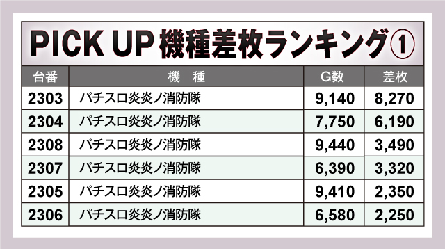 続いて注目機種のご紹介。『パチスロ炎炎ノ消防隊』『スマスロ北斗の拳』『キングハナハナ-30』それぞれが優秀な結果を残しており、中でも『パチスロ炎炎ノ消防隊』は全台プラス差枚の偉業を成し遂げた! 本機に座っていたファンたちは、笑顔の絶えない1日となったことだろう。