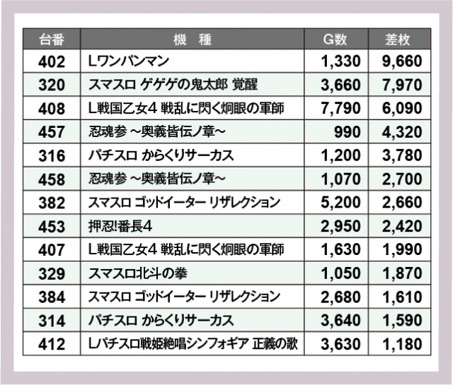 ※差枚数順に掲載しています