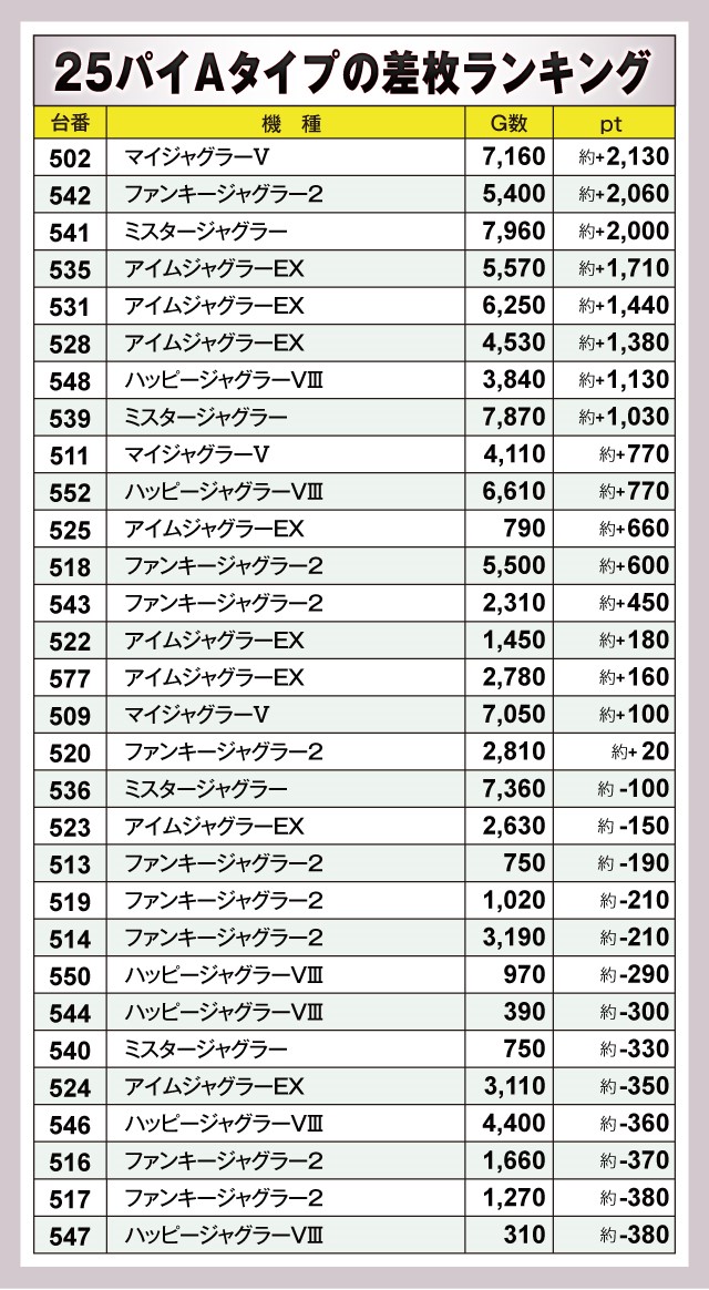 今回は『マイジャグラーⅤ』『ファンキージャグラー2』『ミスタージャグラー』など、複数のジャグラーが2千ptオーバーをマーク。