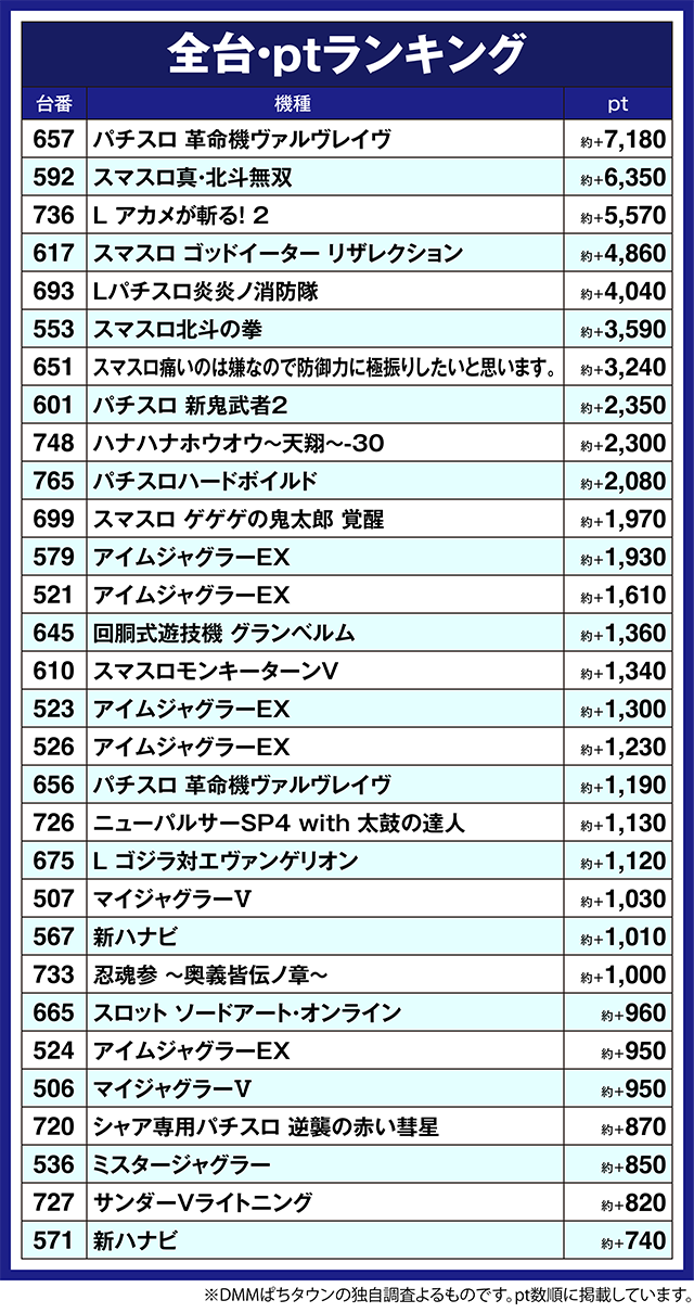 ほかにも、「スマスロ ゴッドイーター リザレクション」の617番台や「Lパチスロ炎炎ノ消防隊」の693番台が約+4,000ptを超えた。