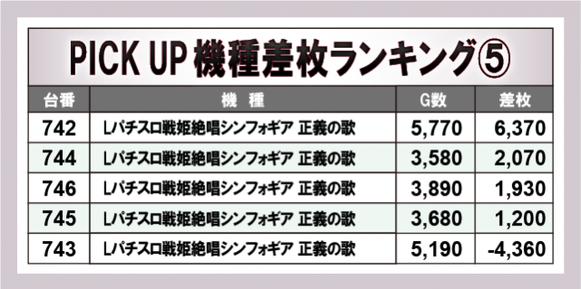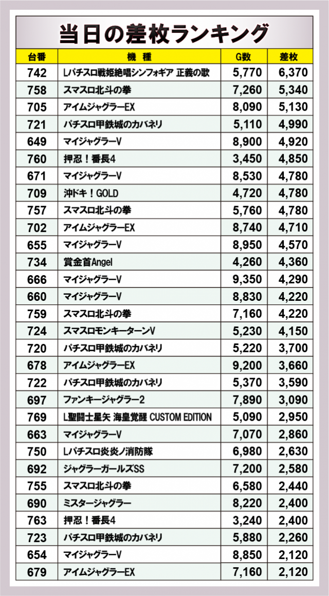 『Lパチスロ戦姫絶唱シンフォギア 正義の歌』742番台・6,370枚を筆頭に『スマスロ北斗の拳』『アイムジャグラーEX』で+5,000枚OVERを記録!全体をみても、終日を通して打ち込まれていた台が多く、ポテンシャルを秘めた台が多数あったのは間違いないだろう。
