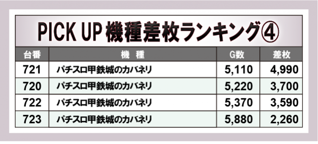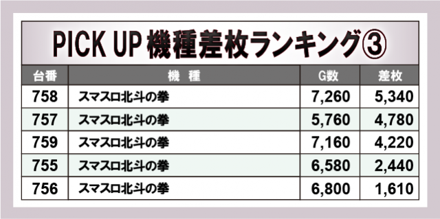 当日とくに店内を盛り上げた機種は上表の5機種だ。人気機種たちの4桁プラス台続出という活躍により、まとまった出玉を獲得したファンは口角を緩めながらレバーを叩いていたはずだ。