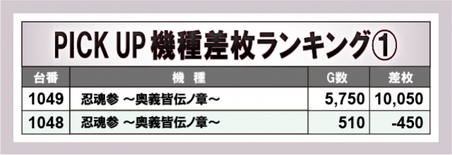 『スマスロ北斗の拳』『忍魂参~奥義皆伝ノ章~』から万枚OVERが発生し、店内の活気と熱気を大いに引き上げてくれた。さらに『パチスロからくりサーカス』から万枚未遂台、『スマスロモンキーターンV』で+8千枚OVERなど、数多くの機種から大台突破台が生まれている。凄まじい熱気を肌で感じ、同店の高い実力に酔いしれたことだろう。