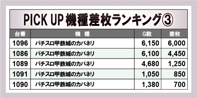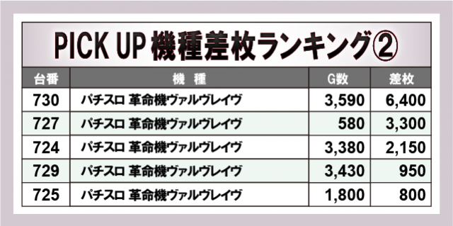 当日とくに店内を盛り上げた機種は上表の5機種。上記でも取り上げた人気スマスロ機はもちろん、スマスロ初期から未だなお現役の『パチスロ革命機ヴァルヴレイヴ』や、6.5号機不動の人気機種『パチスロ甲鉄城のカバネリ』など、しっかりとポテンシャルを解放していた様子で、まとまった出玉を獲得したファンは口角を緩めながらレバーを叩いていたはずだ。