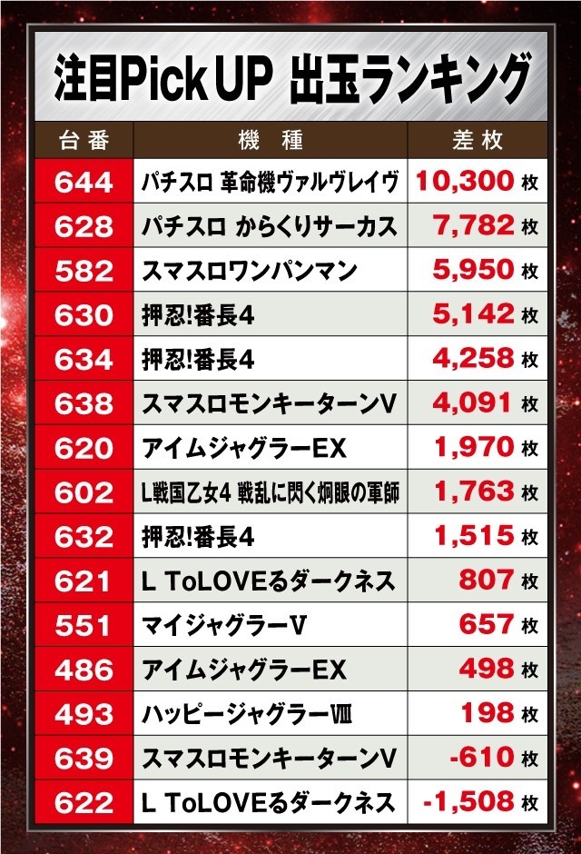 この日、最も注目を集めたのが『パチスロ 革命機ヴァルヴレイヴ』で万枚超の+10,300枚を記録、また出玉ランキング2位が+7,782枚を叩き出した『パチスロ からくりサーカス』と、定番人気のスマスロが上位を占めた。