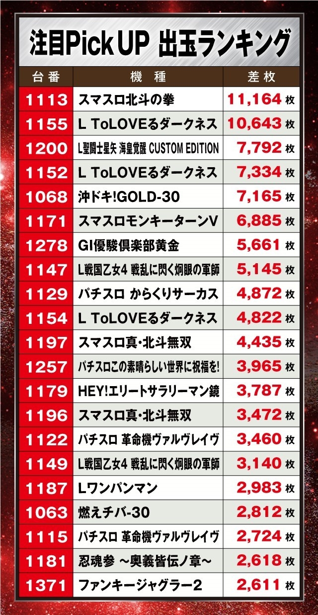 また、その他の機種も負けてはおらず『L聖闘士星矢 海皇覚醒 CUSTOM EDITION』、『沖ドキ!GOLD-30』で+7,000枚超を記録しているだけにファンも大満足だったはずだ。