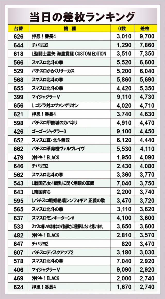 人気機種を中心に名を連ねているのが印象的だが、そのなかで『押忍!番長4』が万枚未遂をマーク。これに続いて、『チバリヨ2』『L聖闘士星矢 海皇覚醒 CUSTOM EDITION』で7,000枚OVERという熱量を披露し、そのほかにも多くの機種がまとまった出玉を確保していたのが鮮烈だ。